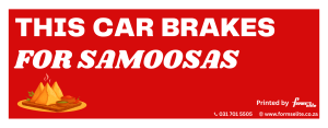 We designed four original bumper stickers that every Pinetown (and Durban) driver can relate to. Whether you’re proudly repping your city or just love a good samoosa pun, there’s a sticker here for you: